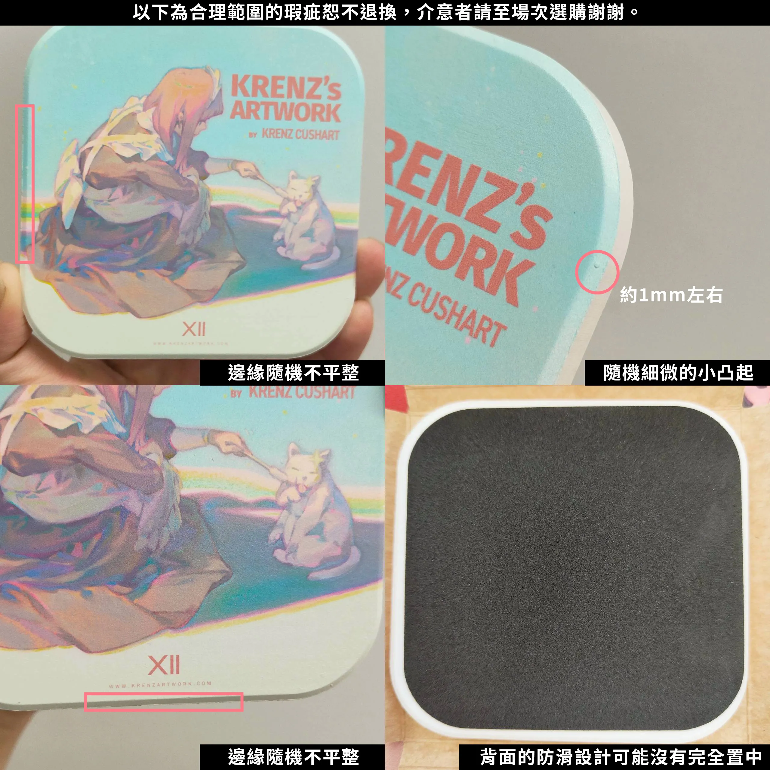 詳細介紹 商品資訊 款式:共 4 款 產地:台灣鶯歌製造,陶瓷吸水杯墊 尺寸:厚度 5mm ±10%,長寬 ±5% 側面採防飛墨處理,邊緣無暈染, 由於製作過程中難免出現細微雜質、凹洞或雜點,屬正常現象 若對此介意,建議至現場場次選購。